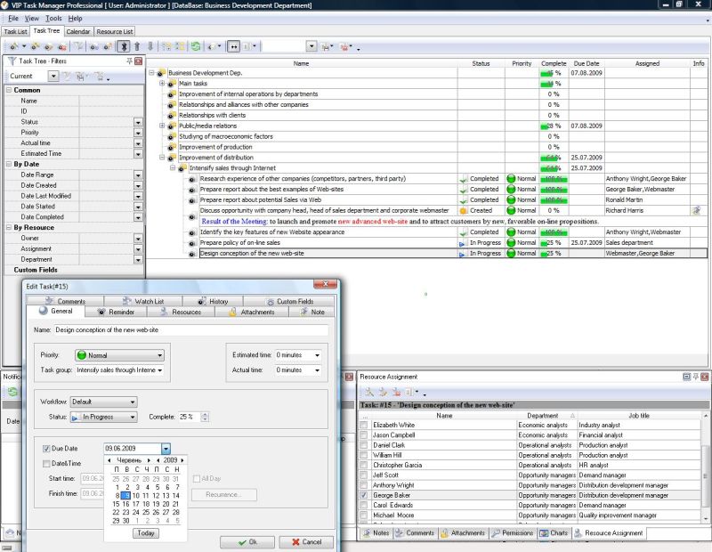 One of the functions of business development department is to give recommendations and consultations regarding questions of development of other departments and general company organization. For effective performance of this function good internal communications should be established. Analysts from business development department should be able to share and discuss documents, tasks and projects with specialists from other departments. VIP Task Manager allows sharing tasks, documents, communicating and sending tasks to external consultants.VIP Task Manager is a groupware that allows users to plan and control work of different departments and cross-department teams within one multi-workflow database |