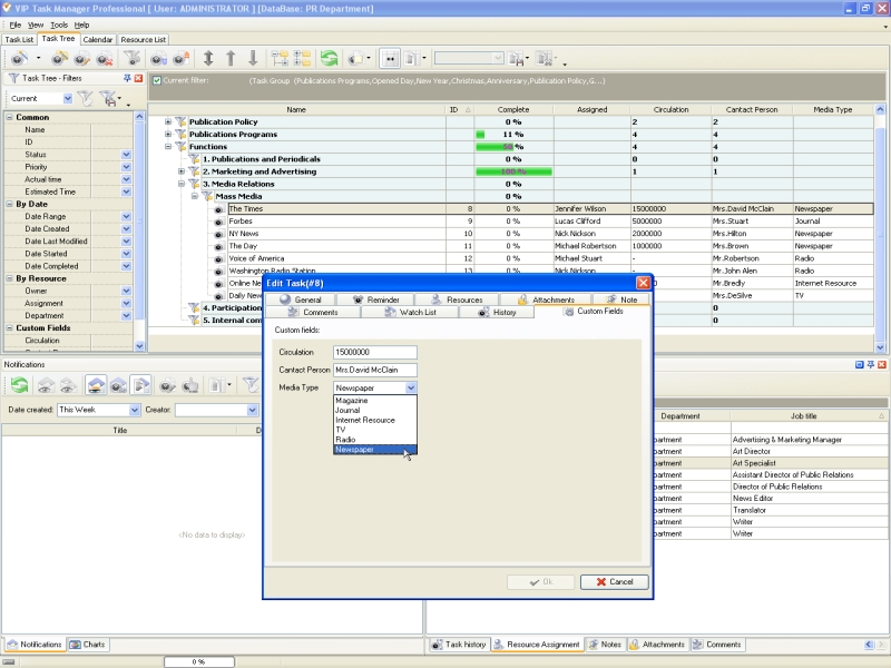 Formation of media relations begins with creation of mass media database which includes maximum quantity of media resources valuable for the company. For example, an industrial enterprise is interested in such media resources as specific industry mass media, business mass media, Government mass media, and specific Internet resources. The main criterion for choosing mass media is its target audience. Skilled PR manager knows about the chosen mass media almost all – target audience, publishing frequency, circulation, names of editors and observers, names of headings, and more. The database for mass media resources should be supported and updated constantly in order to set relationship with mass-media effectively. VIP Task Manager allows to create such a database by using task groups and tasks. PR managers can use custom fields to specify parameters for the mass media database. For example, he can add such task columns as "Media Type", "Circulation" and "Contact Person". In the database each media is a task assigned to an employee of PR Department. This employee is responsible for negotiations and relations with the media resource